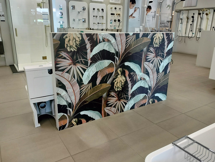 -LA Palmer wallpaper hung in Chester's Plumbing & Bathroom showroom, Mount Maunganui